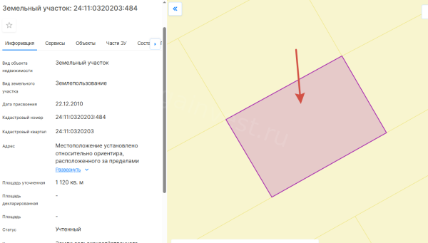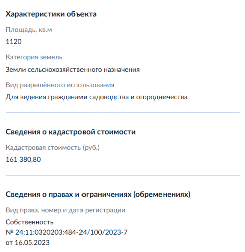 Земельный участок, виды разрешенного использования: дачное строительство, площадь 11,2 соток, кадастровый номер 24:11:0320203:484.