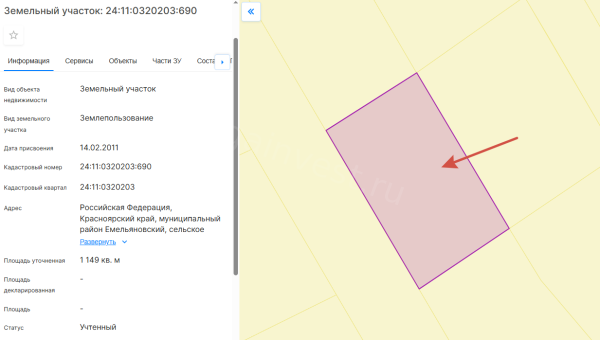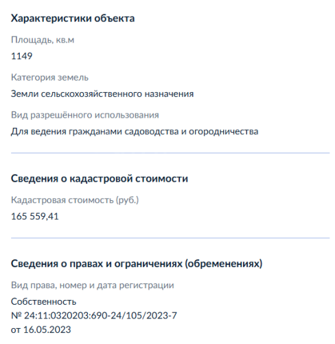 Земельный участок, виды разрешенного использования: дачное строительство, площадь 11,4 соток, кадастровый номер 24:11:0320203:690.