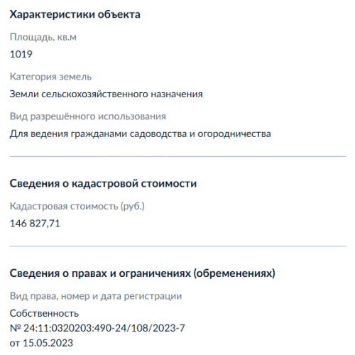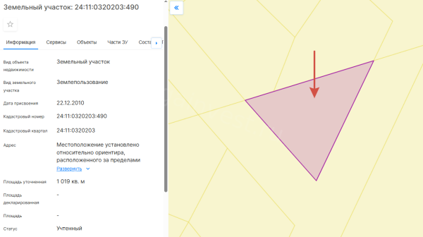 Земельный участок, виды разрешенного использования: дачное строительство, площадь 10,1 соток, кадастровый номер 24:11:0320203:490.