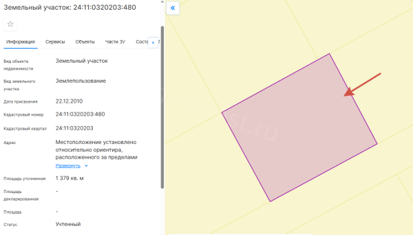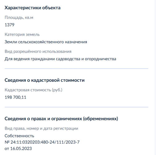 Земельный участок, виды разрешенного использования: дачное строительство, площадь 13,7 соток, кадастровый номер 24:11:0320203:480.