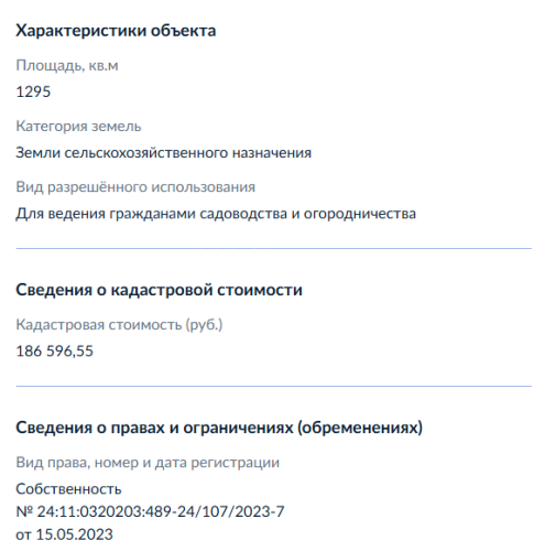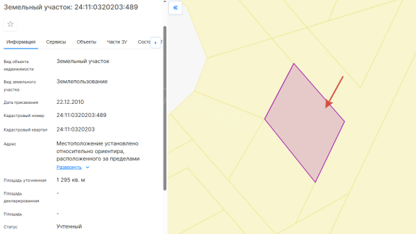 Земельный участок, виды разрешенного использования: дачное строительство, площадь 12,9 соток, кадастровый номер 24:11:0320203:489.
