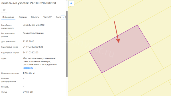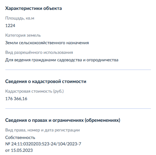 Земельный участок, виды разрешенного использования: дачное строительство, площадь 12,2 сотки, кадастровый номер 24:11:0320203:523.