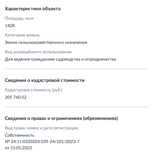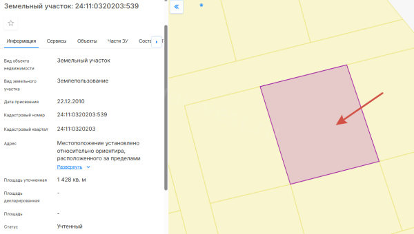 Земельный участок, виды разрешенного использования: дачное строительство, площадь 14,2 соток, кадастровый номер 24:11:0320203:539.