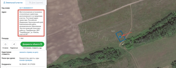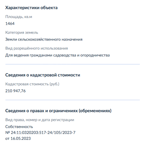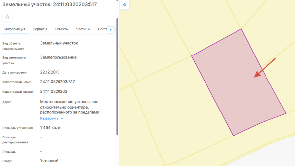 Земельный участок, виды разрешенного использования: дачное строительство, площадь 14,6 соток, кадастровый номер 24:11:0320203:517.
