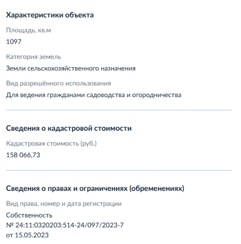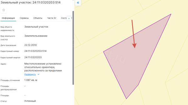 Земельный участок, виды разрешенного использования: дачное строительство, площадь 10,9 соток, кадастровый номер 24:11:0320203:514.