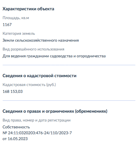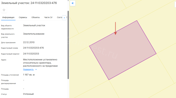 Земельный участок, виды разрешенного использования: дачное строительство, площадь 11,6 соток, кадастровый номер 24:11:0320203:476.