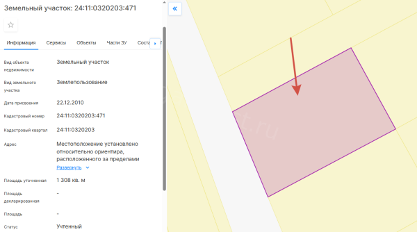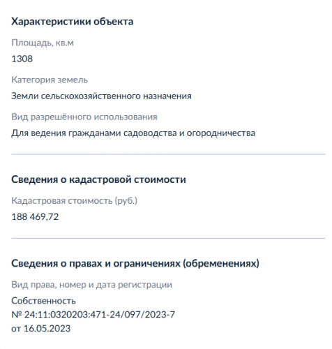 Земельный участок, виды разрешенного использования: дачное строительство, площадь 13 соток, кадастровый номер 24:11:0320203:471.