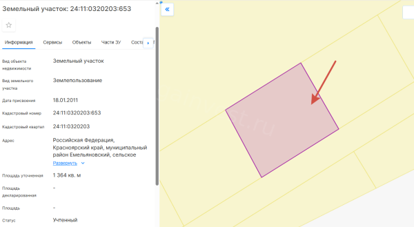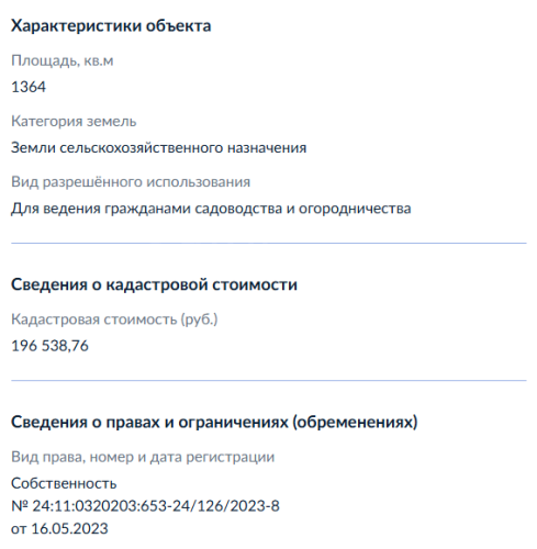 Земельный участок, виды разрешенного использования: дачное строительство, площадь 13,6 соток, кадастровый номер 24:11:0320203:653.