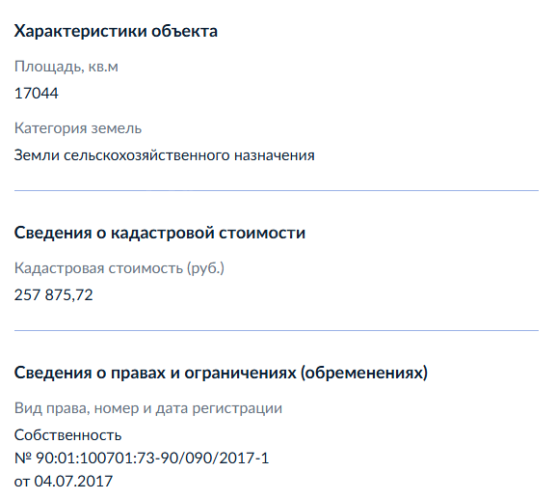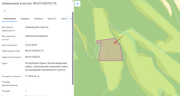 Земельный участок Кадастровый номер: 90:01:100701:73. Площадь: 1,7 гектара. Виды разрешенного использования объекта недвижимости.