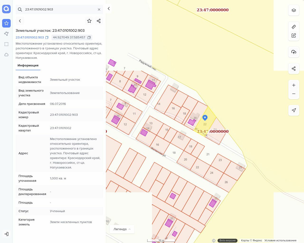 Земельный участок, к/н 23:47:0101002:903, виды разрешенного использования объекта недвижимости: ведение садоводства, площадь: 1000 +/- 11 кв. м., вид права, доля в праве: Совместная собственность супругов, зарегистрированная за Кройтер В. И., дата государственной регистрации: 12.11.2020, основание государственной регистрации: Договор купли-продажи земельного участка (без строений на нем), № б/н, выдан 31.10.2020. Имущество залогом не обременено, аресты отсутствуют.